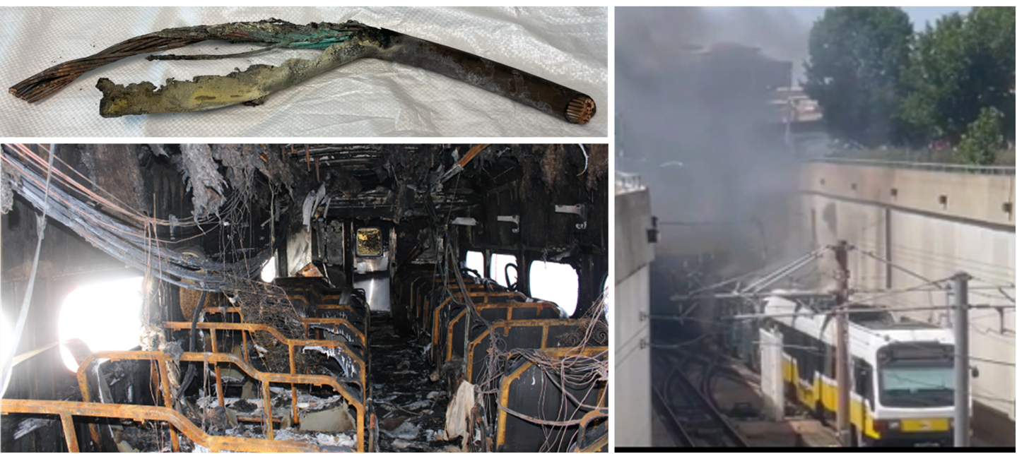 ​​​Figure. (Clockwise from upper left) Damaged third-rail feeder cable from a PATH track in Jersey City, New Jersey; Dallas Area Rapid Transit Train 81 in contact with a low overhead catenary wire in Dallas, Texas (Source: FOX 4 Dallas-Fort Worth); and internal damage to SEPTA railcar following the Ridley Park, Pennsylvania, fire.
