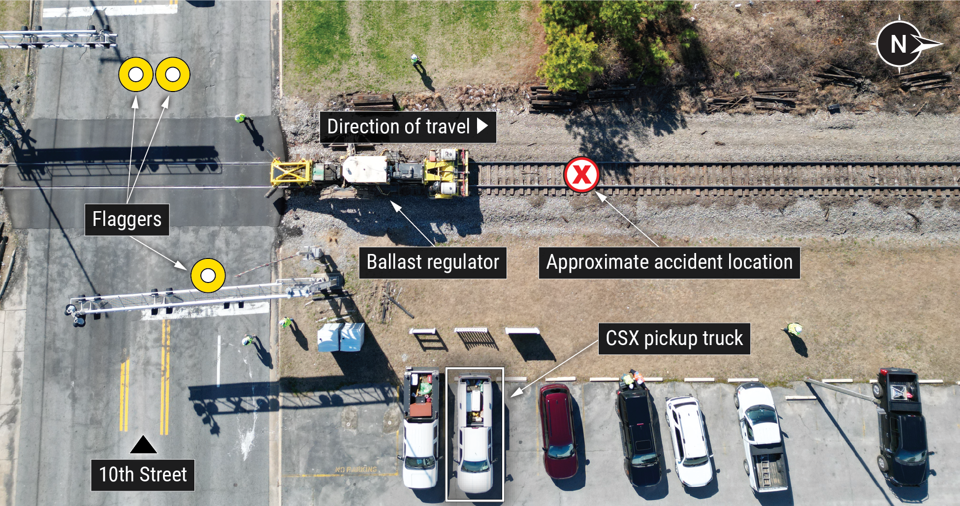 On February 13, 2024, about 1:38 p.m. local time, a CSX Transportation (CSX) maintenance-of-way (MOW) employee was killed when a ballast regulator reversed direction and struck the employee in the gage of the track in Roanoke Rapids, North Carolina. The struck employee was the foreman of a CSX crosstie replacement team that was using the ballast regulator and other equipment to perform track resurfacing and crosstie replacement near milepost 81.61 on a CSX North End Subdivision industry spur track. Visibility conditions at the time of the accident were clear, and the temperature was 51°F.